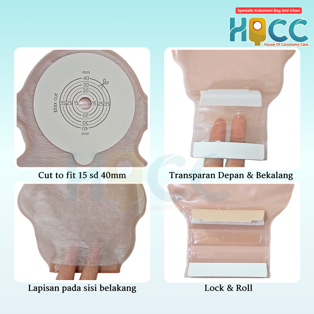 1. Model one piece dan bagian bawah terbuka. 1 kantong kolostomi dilengkapi dengan 1 klem